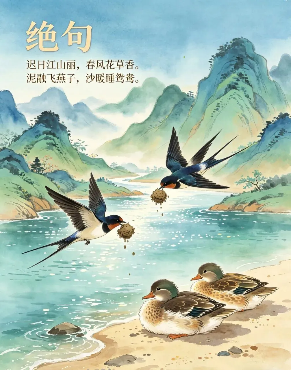 解释:春日里,江山显得格外秀丽,春风送来花草的芳香。冻土融化,泥土湿润,燕子忙着飞来飞去衔泥筑巢;温暖的沙滩上,鸳鸯安静地睡着。