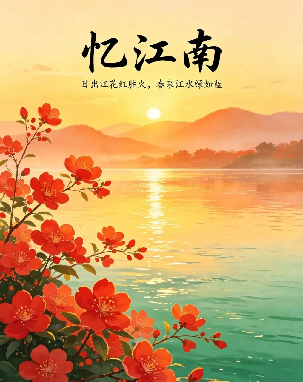 日出江花红胜火,春来江水绿如蓝。能不忆江南?