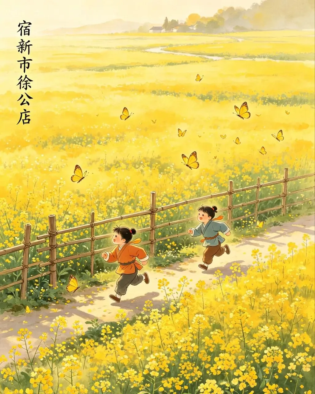 解释:篱笆稀稀落落,一条小路伸向远方,树上的新叶刚刚长出,还没形成树荫。小孩子奔跑着追赶黄色的蝴蝶,可蝴蝶飞入金黄的菜花丛中,再也找不到了。