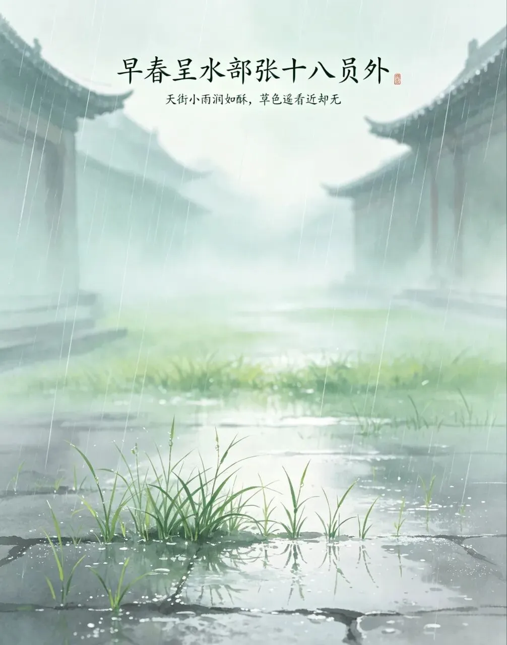 解释:京城的小雨细腻得像酥油一样,远看小草已经有了颜色,走近看却又看不清。这是一年中春天最美的时候,远远胜过京城杨柳如烟的晚春景色。