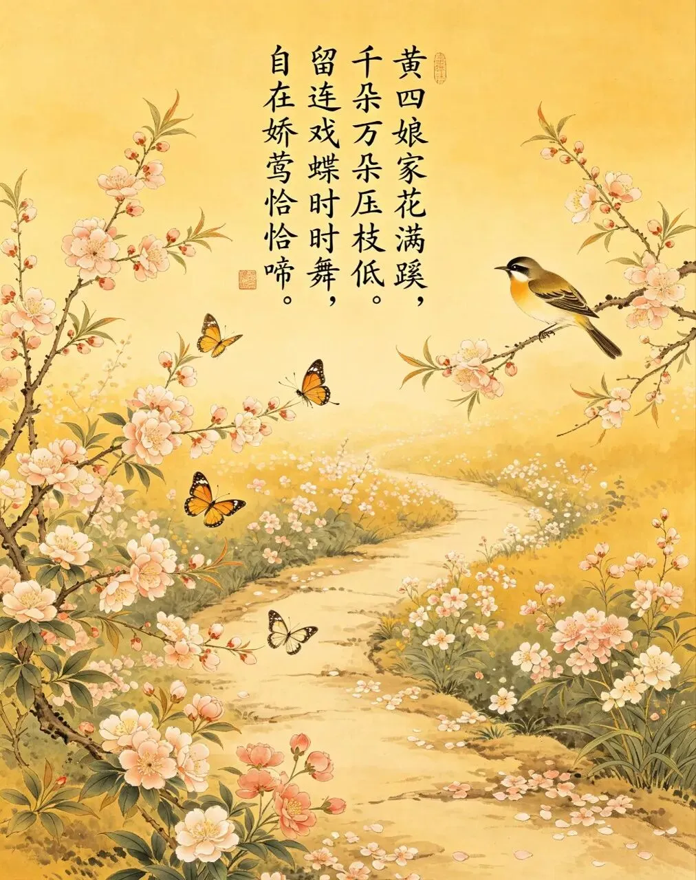解释:黄四娘家的小路上开满了鲜花,千朵万朵的花儿把枝条都压弯了。嬉戏的蝴蝶在花丛中飞舞不肯离去,可爱的黄莺自由自在地婉转鸣叫。