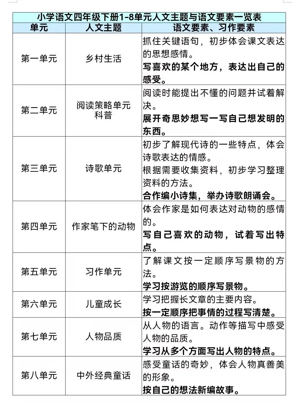 统编版小学语文四年级下册教科书共安排了8个单元,其中6个单元是以人文主题和语文要素双线结构组成的单元。