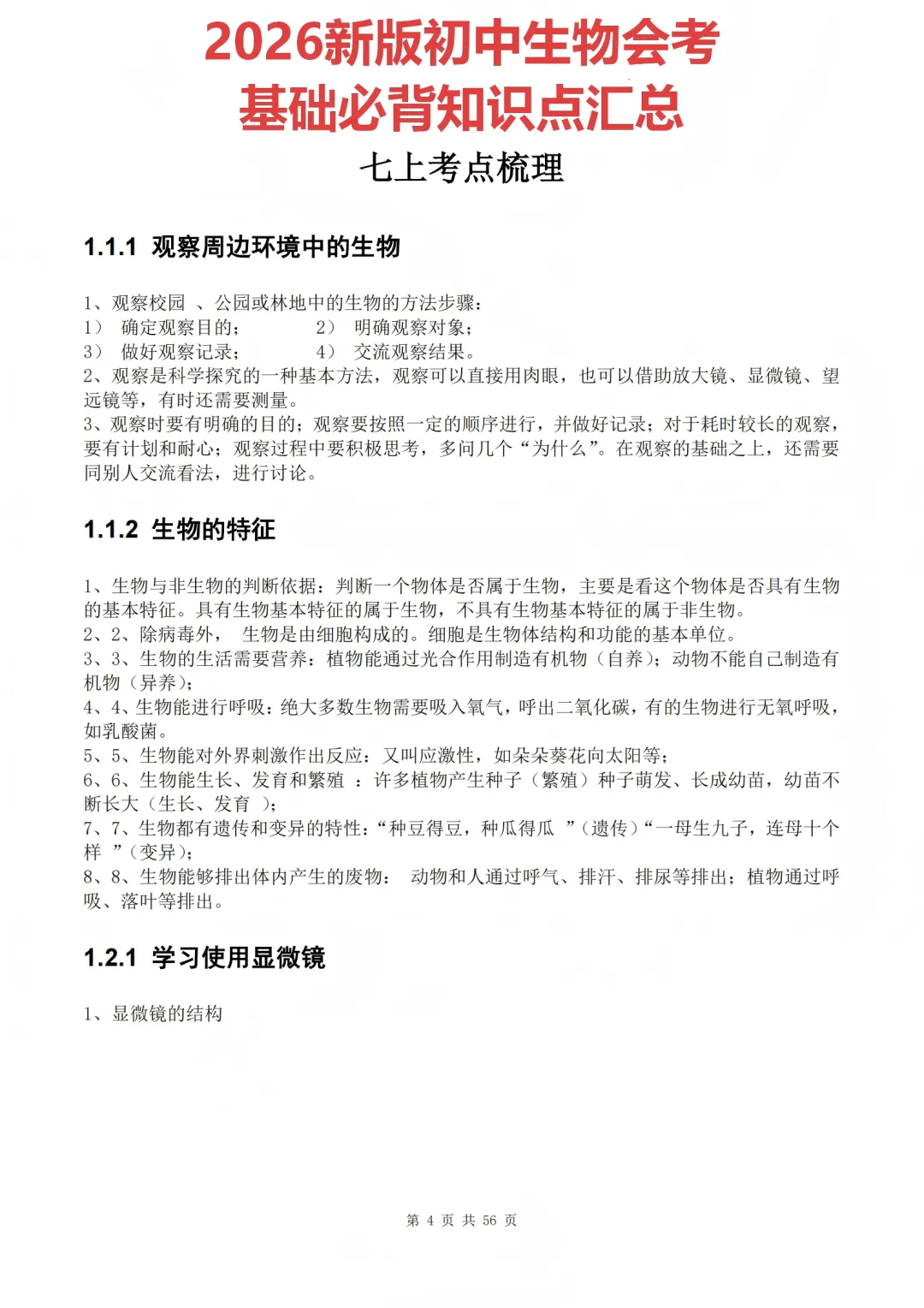【新版本】新教材 2026 初中生物会考基础必背知识点汇总,电子版可打印!