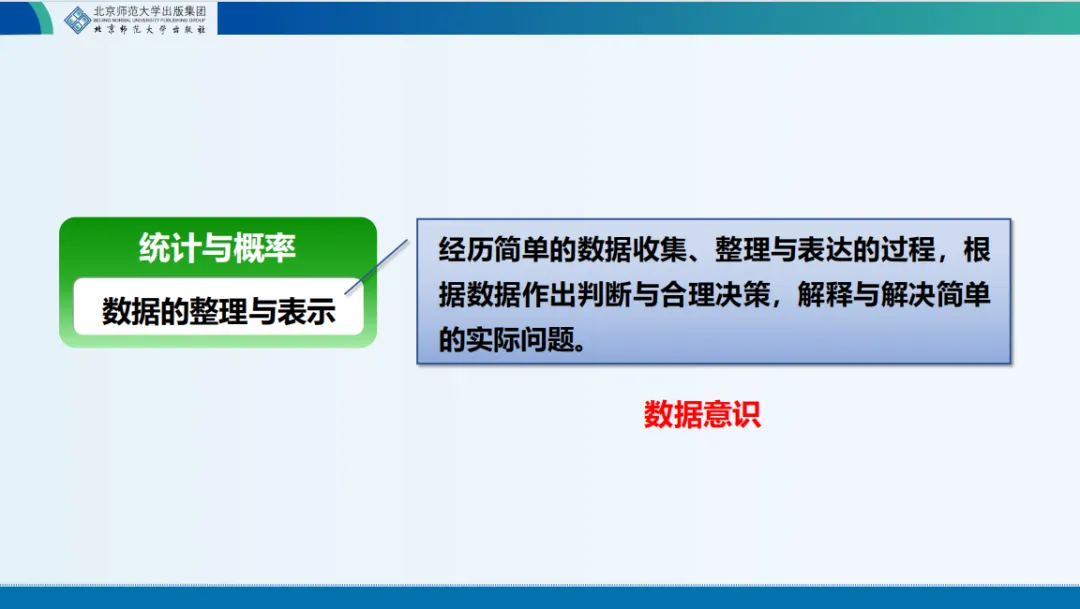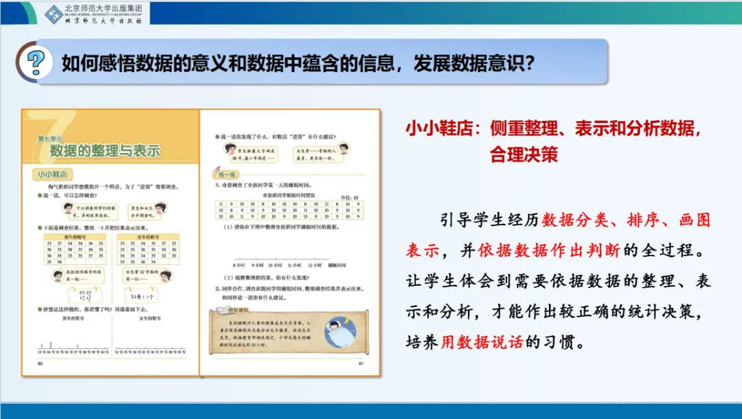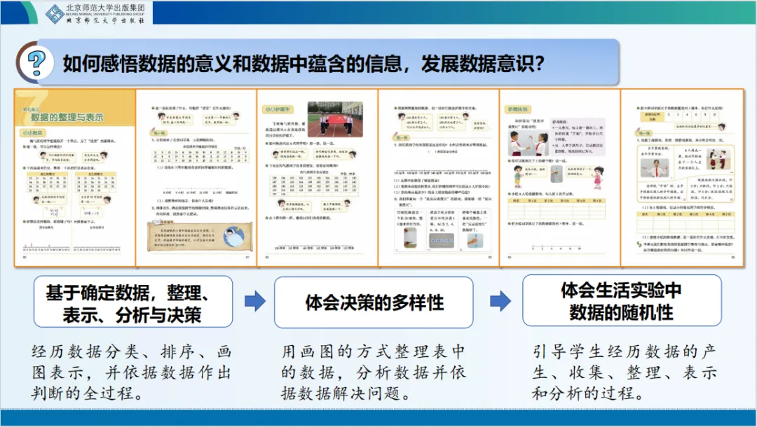 在本单元的学习中,以学生熟悉的现实情境为载体,引导孩子完整经历数据收集、整理、表达、分析、决策的全过程,在动手操作、合作交流、反思纠错中,理解数据意义、发展数据意识核心素养。一、教材编排体系