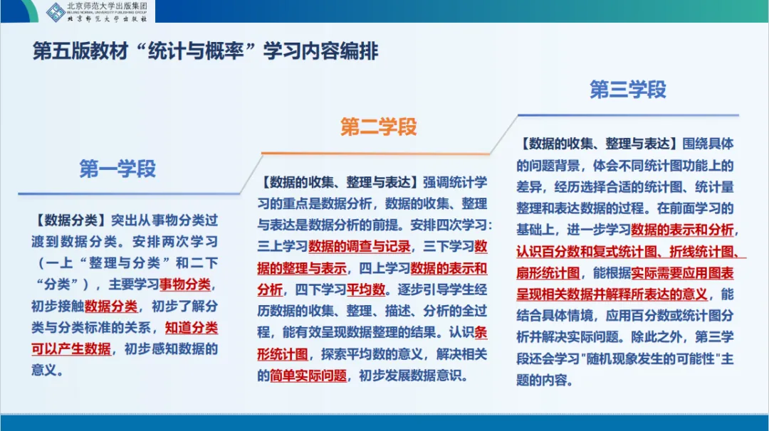 学生核心素养的发展重点是数据意识。首先我们来看一下第五版教材《统计与概率》这一部分内容的编排体系。本单元不是孤立存在的,而是整个统计序列中的关键一环,承接旧知、启导后续,清晰构建学生的数据认知路径。第一学段:数据分类(基础铺垫)