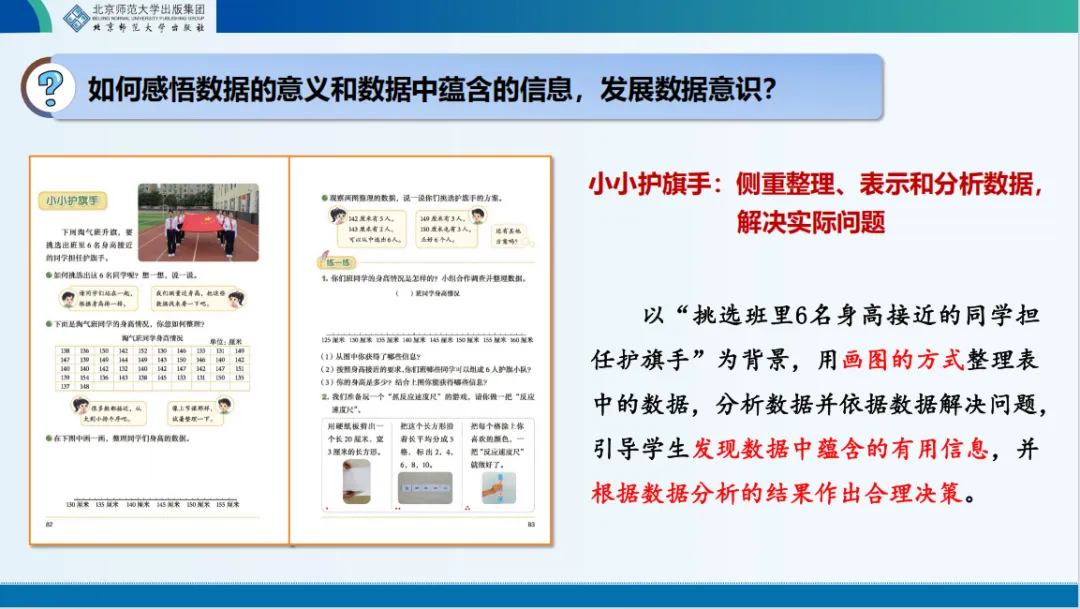 《小小鞋店》聚焦给定数据,重点训练分类、排序、画图整理与分析,依据数据做合理决策,建立“用数据说话”的意识;《小小护旗手》聚焦解决实际问题,引导自主制定方案、整理分析数据,体会决策的合理性与多样性;《抓得住吗?》聚焦实验与游戏,突出数据随机性,在重复试验、记录数据中感受数据可能变化,同时蕴含规律。4.重视数据核查与反思,培养严谨态度