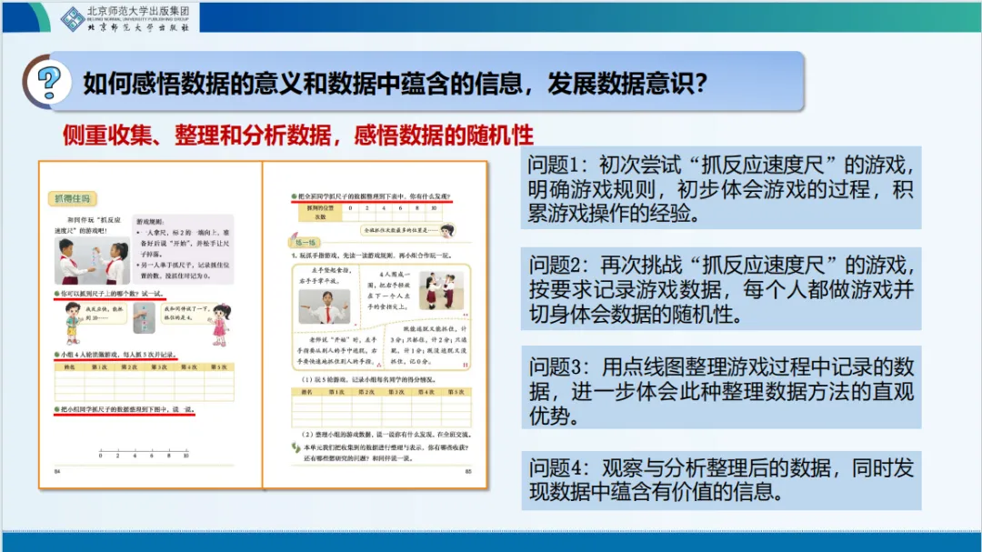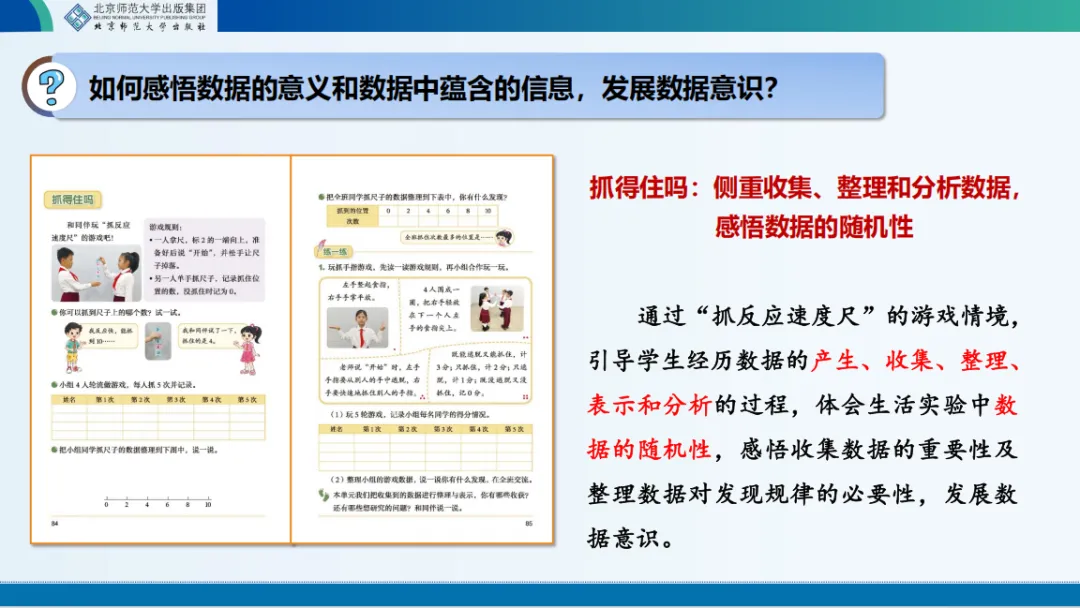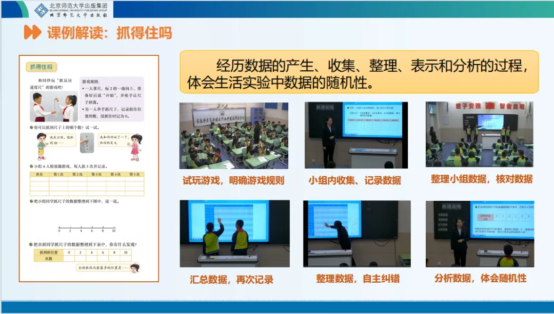 不重计算、重过程,不重结论、重体验,让学生感受统计是解决问题的重要方法。结合随机试验(如抓尺子),初步感悟数据随机性,在变化中寻找规律。认真记录、规范整理、仔细核查、有理有据分析,逐步形成数据意识。
