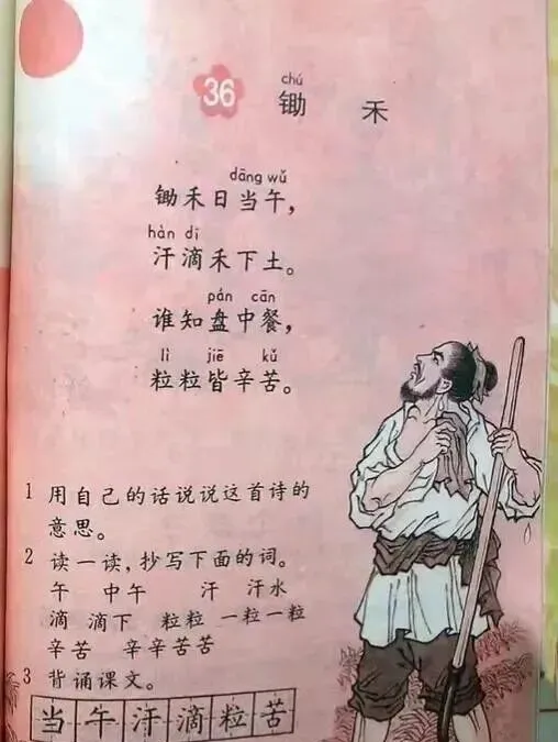 这个页面不用多说,锄禾日当午,汗滴禾下土,真背了一辈子,图里那位络腮胡老伯弯着腰,裤腿卷得高高的,脸朝太阳抹汗,板着脸却透着实在劲儿,小学第一回学会“粒粒皆辛苦”时,还以为“粒粒”专指米饭呢,后来被老师问住,才知道“每一口都来之不易”,小时候爷爷边插秧边念这几句,说“吃完饭得舔盘子,粮食都是汗换来的”,现在的孩子,饭粒掉地上都不捡,外卖饭扔一半也心安理得,那种靠劳动换温饱的日子只在课本里能翻到。
