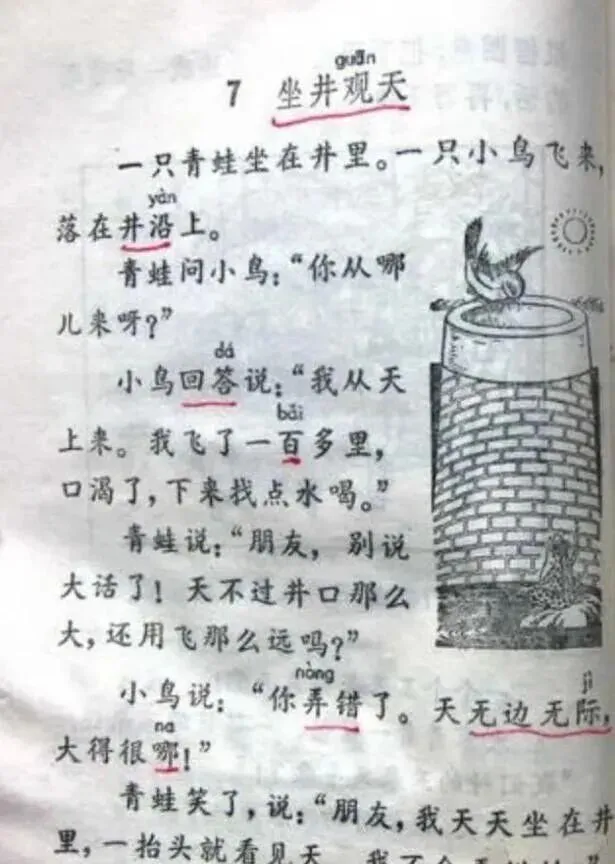 这张“坐井观天”,青蛙仰着脸坐井底,一只小鸟跳井沿上,旁边太阳画得简单,青蛙说天只有井口那么大,可小鸟说天无边无际,小时候读到这,总想着爬上砖井去瞅瞅天外头是不是还有别的,妈妈有时候边干活边给我讲,“别总觉着自己看见的就是全部”,这话现在听还带劲,那会儿全靠插图带想象,黑白方块勾两笔,够咱想半天了,不像现在满页彩色,讲大道理比画还多,人一多,心反倒不自由了。