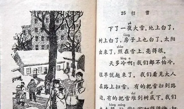 看“扫雪”这一整页,就是一股子热乎劲儿,全都是孩子们撸起袖子拿扫帚,一大早顶着冻耳朵堆雪人,有的推到院子里,有的堆到树根旁,最喜欢课本这种直接逮生活场面的插图,场景真切,动作特有样,冬天冷归冷,屋子里说“上学不迟到”,谁家都有扫雪的活,妈妈说“越冷越锻炼人”,现在的雪倒是下得少了,扫雪成了清洁工的活,家长和娃都少出门了,路上干干净净,热闹劲还真让暖气房给吹化了。