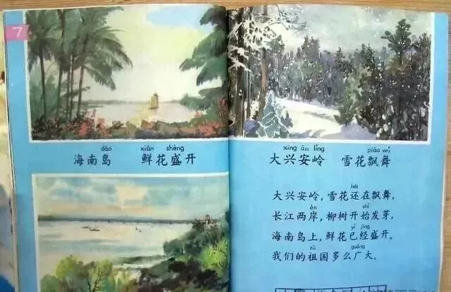说到插图,现在的小孩看可能算简陋,咱们却觉得是块宝,蓝底配水粉画出来的海岛、树林、雪原,画面里没有嘈杂,没有乱七八糟的广告,只有静谧的、鲜活的童年记忆。我小时候经常趁老师不注意盯着插图发呆,看着画想象故事,春天、夏天、秋天、冬天,四季流转都画细了。
