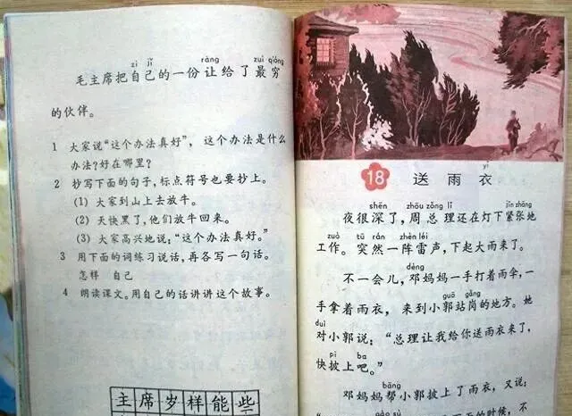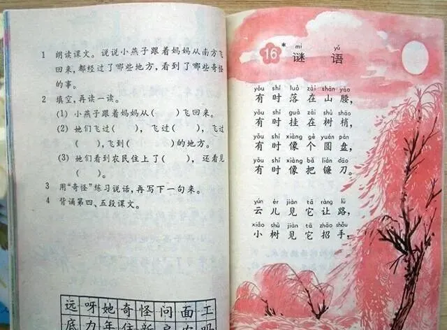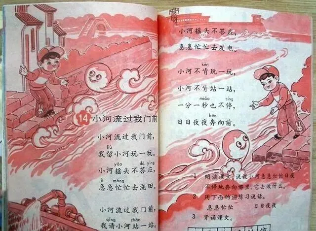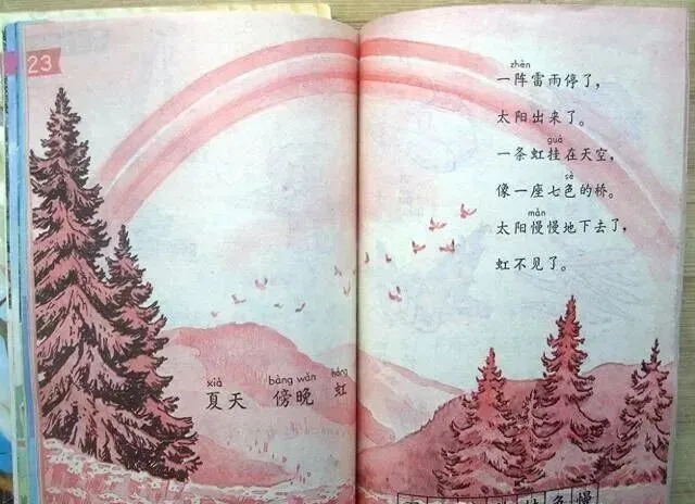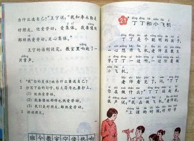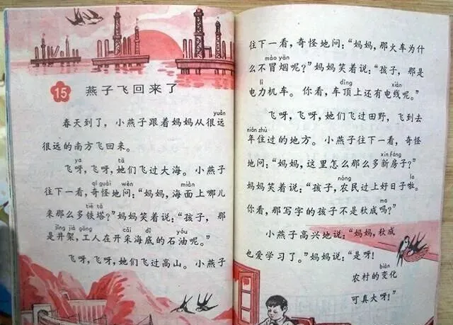 妈妈那会儿在厨房切菜,还能听见我屋里背课文的声音,她推门问我,怎么又念“京生也爱学习了”,我说老师非得让一字不差地背,现在想想,课文里好多顺口的话全都扎心里了,“天上飞来一只大鸟,不对不对那是飞机”,小时候觉得好玩,现在也就那个年代能编出这样的句子。