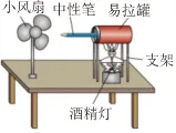 实验时向易拉罐内部注入大约半罐水,将去掉笔芯和尾塞的中性笔的尾端插入易拉罐内,用胶将罐的开口处密封。将易拉罐放置在支架上,笔的尖端对准小风扇的扇叶。点燃易拉罐下面的酒精灯,当有蒸汽喷出时,扇叶就转动起来。