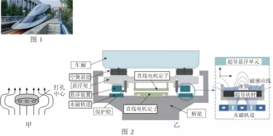 在高温超导磁悬浮列车研究中,我国应用先进的高温超导钉扎磁悬浮技术,利用无形的磁场将列车上的超导材料牢牢“钉”在轨道上方。这源于超导材料自身的磁通钉扎特性,如图2甲所示,下方永磁轨道产生的磁力线能穿透高温超导体,并被钉扎中心“抓”住。这使得高温超导磁悬浮列车具备了自稳定、自悬浮、自导向的优异特性。如图2乙所示,高温超导体上方放置的液氮用于冷却,使得列车运行仅依靠液氮冷却超导体,成本极低。