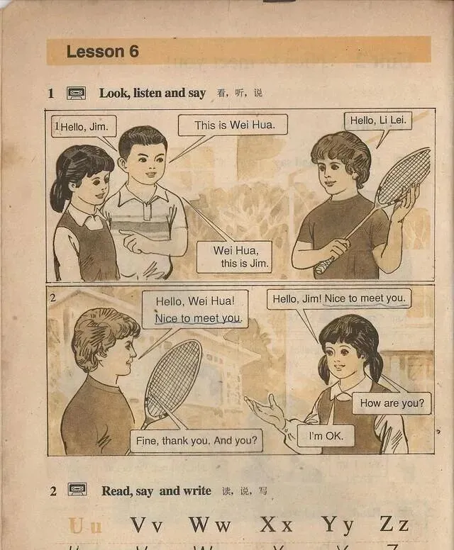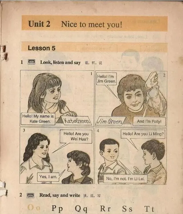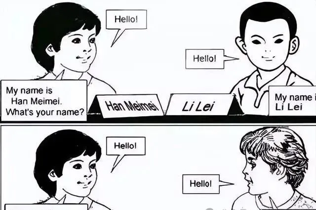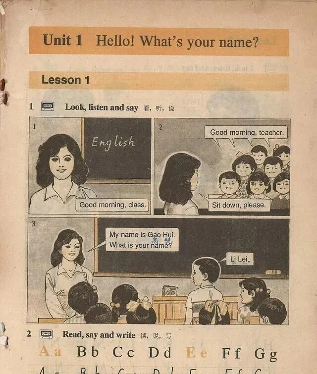 这页教材里头,对话气泡几乎已经刻进脑子里,“Hello!”、“My name is Han Meimei. What’s your name?”一句一句刚学那会儿全班一起喊得山响,男生女生排着队轮流念,老师停下来讲得仔细,谁喊快了都得从头来,一到复习课,大伙儿就抢着扮李雷,对着同桌鼓捣半天,就是不肯让女生演韩梅梅,这种死板对答,用现在孩子话说多少有点呆气,但那时候觉得新鲜得很,家长还会在一旁瞅着笑,自己练出声,“hell-o,my name is...”,念得比谁都溜。