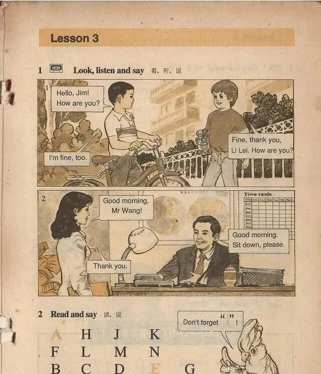 教材最有意思的就是这些“纸片人”——李雷、韩梅梅、吉姆、凯特,再加上一只小鹦鹉Polly,每个人物都有穿着、发型和不重样的家庭关系,教书的、做经理的、退休的,绘本里的家长背影总被说成“很有范儿”,回头看可能没那么讲究,但看了几十遍的插图,总觉得亲切极了,经常一边模仿剧本对话一边扮动作,“This is Wei Hua. Hello, Jim. Nice to meet you.”我妈当年还说,怎么你这本书里的人都在打招呼,难不成老外出门见谁都这几句话,后来才明白,就是这些场景把基础一块块铺了起来。