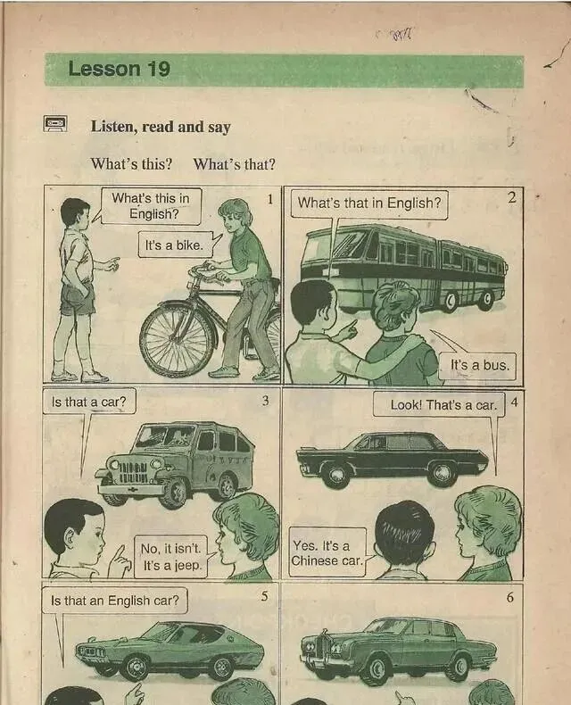 翻到这页老课本,童年气扑鼻就上来了,汽车、自行车、巴士、吉普,一个个全用铅笔画出来,男孩女孩站在一旁问“What’s this in English?”,一边伸胳膊一边望着前面,“It’s a bike.”,“No, it isn’t. It’s a jeep.”这种场景在那时候一点不觉得生涩,总盼着下课能和同学到楼下拉风模仿,书上的吉普和咱们家门口的破自行车天差地远,可咱完全不觉得自己差什么,学得起劲,也不知道啥叫口音,想的就是谁能快点把单词拼下来,家里的小伙伴会一起甩书念半天。