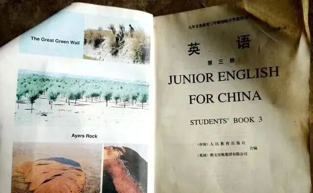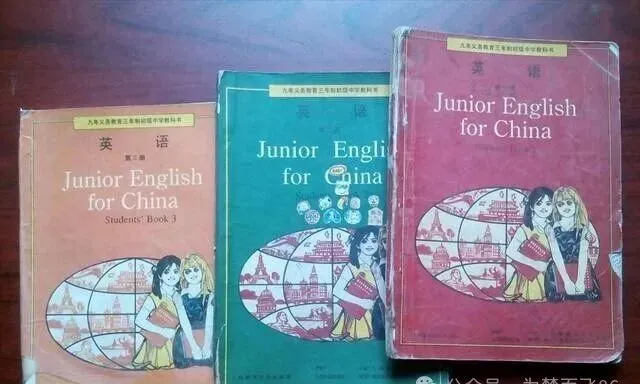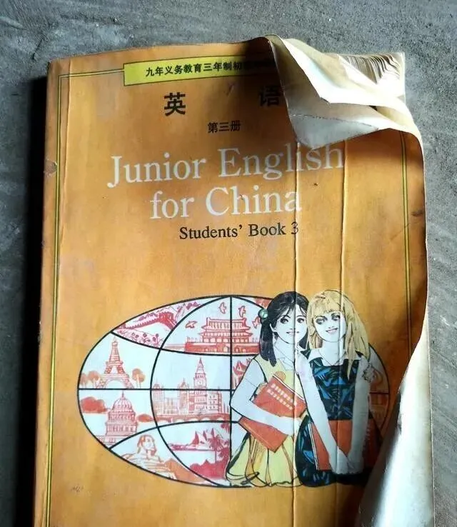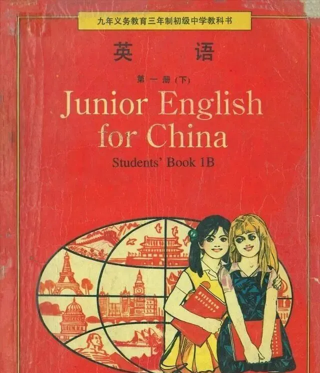 图里这本书叫**《Junior English for China》,一水红封皮,左边一大块地球,里头画满了各国地标,右边两位小姑娘手挽手站着,笑容稚气,还搂着书本,那时候分不清哪个是Lucy**,哪个是Lily,反正每天早自习都在和她们打照面,家里书柜都得留一本,封面老掉,角还卷成卷,用手一摸糙糙的,有人一看就能想起开学第一天发新书那会儿,高兴得不得了,攥着不肯撒手。