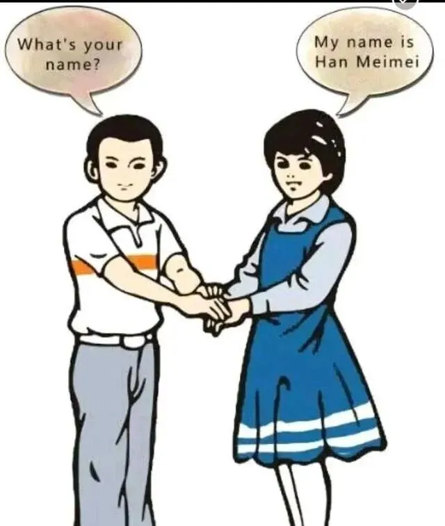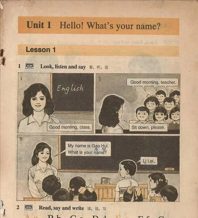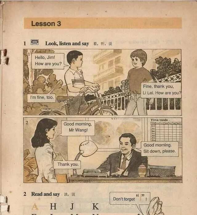 这个画面大家都熟,就是Li Lei和Han Meimei握手,"What's your name?"和"My name is Han Meimei",只要背过这一页,英语课就算有个开头,班里总有调皮鬼模仿说"我叫李雷,我叫韩梅梅",弄得大家哈哈乐,后来才知道,这两位已经成了九十年代学生的集体回忆,谁要是不知道他们名字算是白上初中了。