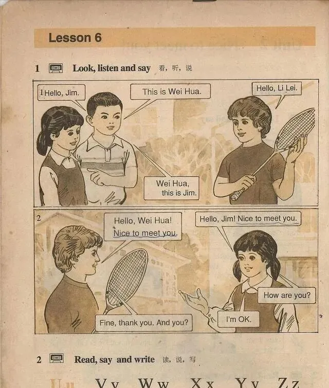 图上有课桌前对话,老师一个,学生三个,有人拿羽毛球拍,"This is Wei Hua"、"Nice to meet you"是必背的句子,背不下来不敢交卷,课表一画就是一星期同一个流程,早晨练口语,下午写作业,晚上蹲厕所还琢磨哪个单词拼对了没,家里大人走过来就一句:"你们现在学得比我们那个年代可多多了",道理谁不懂,就是当时苦兮兮,回头看是踏实。