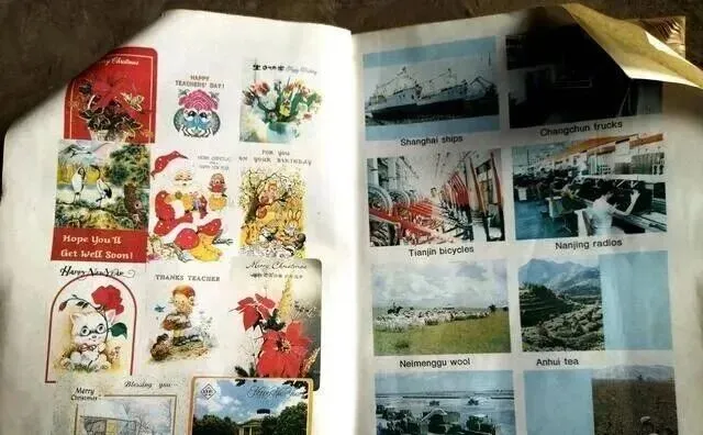 翻到这一页,左边英文字母布满明信片和小画片,圣诞节、儿童节、祝老师早日康复,右边全是工厂流水线和崭新轮船,这些东西小时候见着新鲜极了,总觉得外国啥都洋气,家里堂哥说等以后有机会一定要出国转转,那时候觉得离得忒远,现在回头一看,只要打开旧课本,哪里想去都能到咯。
