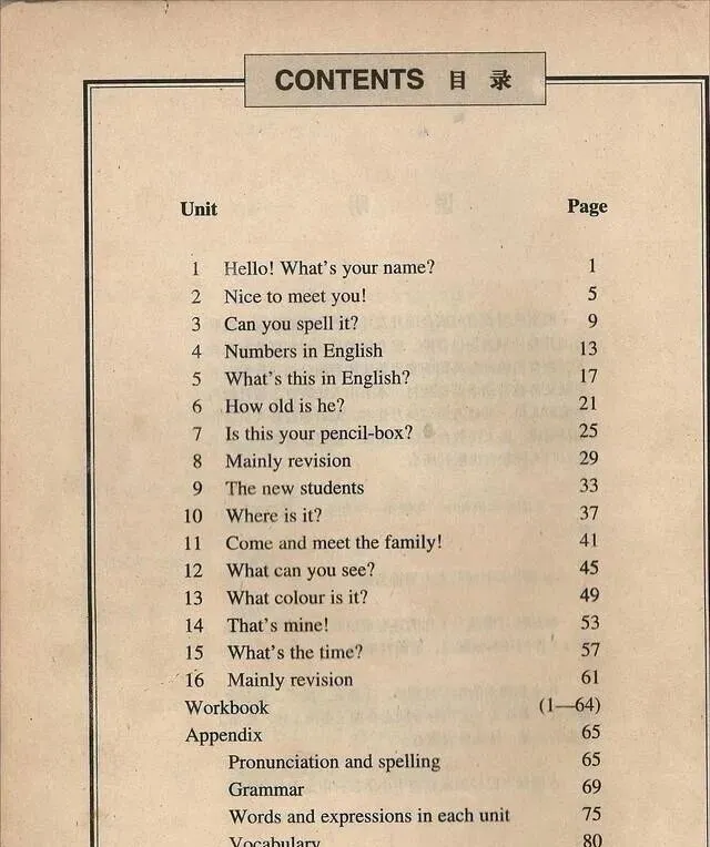 这页目录,Unit 1到16,一个单元一句口头禅,"What's the time?"、"Can you spell it?",每看一眼都觉得时间翻了个头,语音磁带反复倒带,一遍遍练"Good morning"、"Fine, thank you",练得耳朵里都打结,现在孩子问爸妈"你们以前怎么学外语",随口就是:咱们那时候就那几本书、一个录音机,一根指头一行指着念。