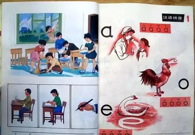 说到汉语拼音这几页,记忆太深了,红色小框里画的声音符号,a o e围着大公鸡和白鹅转圈圈,护士帽的阿姨教小女孩发音,小孩子在课桌前拿着铅笔一遍遍画圈练,拼音的那点口诀,现在还剩一大半,学会了教弟弟妹妹,最早的自豪感都是这么来的,老师在讲台上比划得飞快,我们跟着读一溜声喊出来,手法笨拙,结果字母歪歪扭扭地挤在格子里,隔壁的同桌还会偷偷把e字画成个勺子模样。