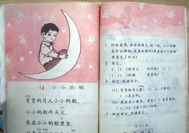 这张粉粉的底色一出来,多少人一眼认出来,小小的船,雪白的月亮歪在角上,小男孩坐在月牙上晃着腿,头发软塌塌的,旁边几个歪歪斜斜的小星星,刚上一年级识字不多,这一课全靠老师一句一句领着读,等会背下来可骄傲了,那阵子看见天上的月亮还真以为能变成小船,踩着星星能飘走,傻乎乎跟同桌争半天到底谁坐在上头才最舒服。