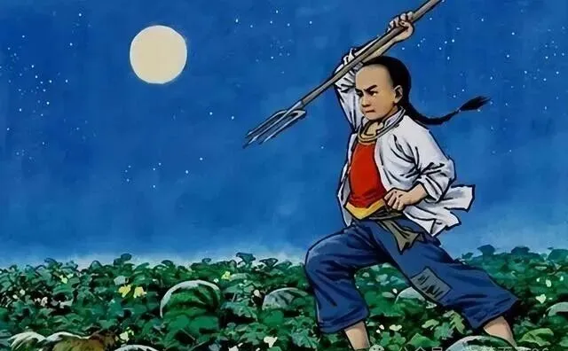 这幅画不得不说讲究,少年闰土,月光蓝得像墨水,黄澄澄的圆月爬在天中央,小辫子甩在脑后一把叉子高高举着,西瓜地上一片深绿,小时候读这篇故事脑子里全是这个画面,老爸说这叫“月下刺猹”,我硬记了好几年,那种安静里透着紧张气儿,呆呆地看着这画,觉得人能钻到瓜地里冒险一把,后来才知道小时候的勇气也许全藏在课本里没带走。