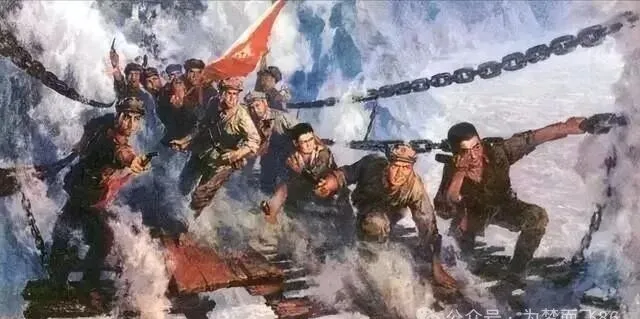 这幅画刚翻到,有点被吓着,铁链当桥,浪花四溅,一群人猫着腰爬过去,背上背着枪,军旗飘在最前头,这课文讲完以后,教室里安静得能听见呼吸,小学的小男孩全都崇拜地盯着黑板,那会儿根本不懂什么牺牲,就觉得勇气了不起,等到快毕业了才明白这种画是会让人心头发沉的,奶奶说“你们现在看这个,就当故事了”。