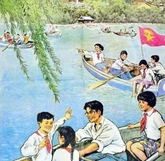 这就是童年最美好的模样,阳光下的湖水泛着光,小伙子姑娘们坐在船头,白衬衫配红领巾,划桨水花飞起来,岸上有人搂着同伴聊天笑着指着远处,风吹柳条,小旗子在最前头飘得飞扬得很,那会儿没有手机,课本里这画面怎么看都看不厌,后来每次听歌都会不自觉想起这画,原来有些记忆,是荡不走的画面。