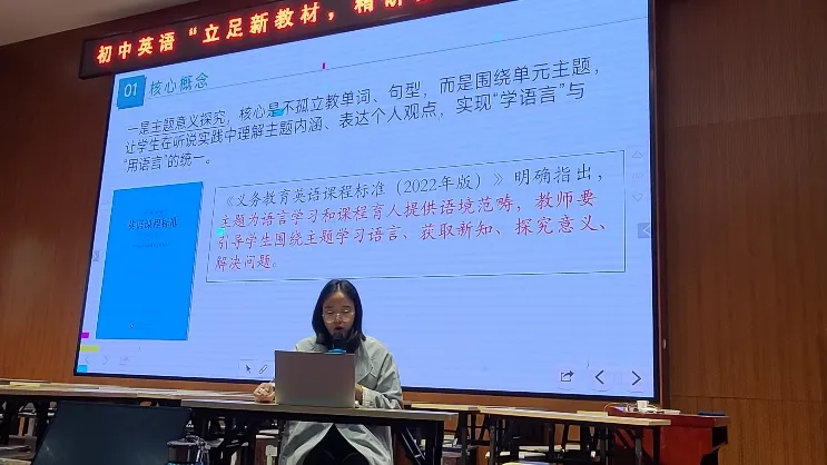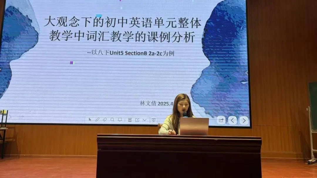 林文倩老师以人教版八年级下册Unit5 SectionB 2a-2c为例,阐述了大观念视角下初中英语单元整体教学中的词汇教学路径。她指出,传统词汇教学存在碎片化问题,而单元整体教学能让学生在主题语境中系统运用词汇。她介绍了英语学科大观念的中心性、网状性与迁移性特征,并总结了“单元内容分析→学情分析→构建大观念→确定教学目标”的四步框架。在具体课时设计中,她采用“学习理解→应用实践→迁移创新”的递进模式,通过真实灾害案例、复合词构词法、小组造句、语篇填空及重庆山火文本分析等活动,帮助学生掌握灾害相关词汇及搭配,提升语境运用与信息提取能力,同时渗透团结互助、珍爱生命的育人理念。她强调,大观念引领下的词汇教学应跳出碎片化局限,让词汇真正服务于主题表达与素养发展。