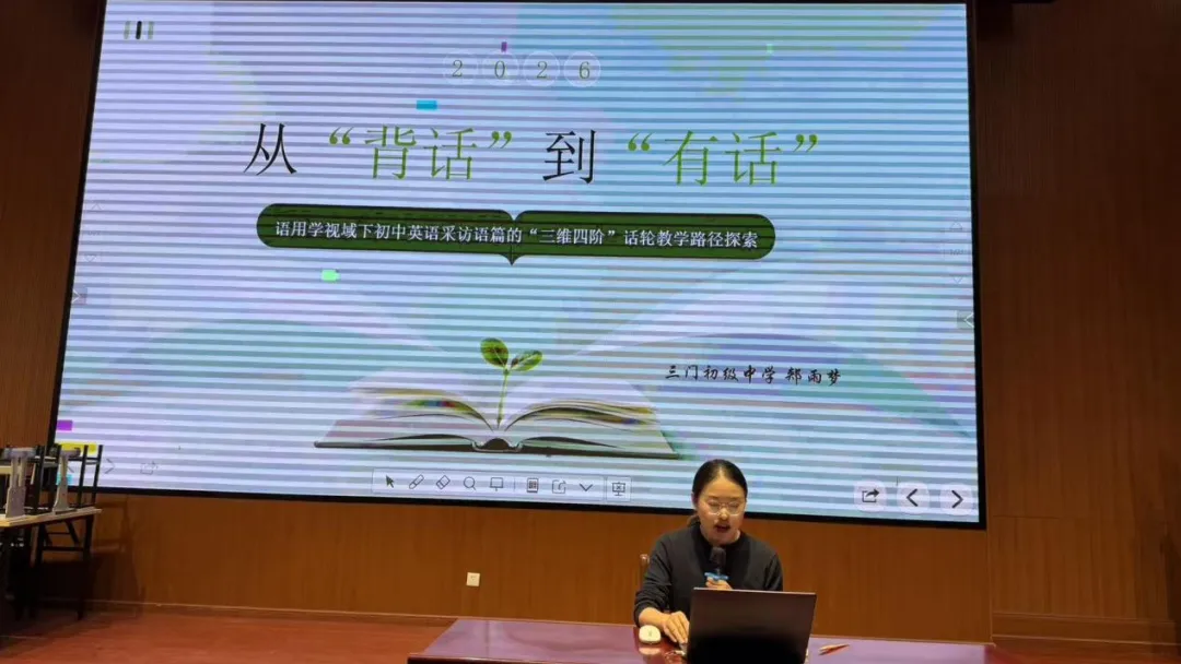 郏雨梦老师围绕初中英语采访语篇教学,提出从“背话”到“有话”的“三维四阶”话轮教学路径。她指出,当前对话教学重语言形式、轻交际功能,学生只会背诵课本对话,却无法在真实情境中发起、维持和转换话轮。基于2022版课标的语用知识要求,她选择八下Unit 5采访语篇为载体,因其具有真实互动性、话轮转换明确和角色关系丰富等特点。她构建了“三维解析模型”(结构之维、功能之维、情感之维)和“四阶演进路径”(感知与解构、模仿与内化、迁移与创作、应用与创新),并通过结构化分析表格、采访逻辑导航图等工具,引导学生理解话轮背后的逻辑。她还设计了以话轮逻辑性、语言得体性、策略灵活性为核心的评价体系。她强调,话轮是可教的,逻辑是话轮教学的关键切入点,最终目标是帮助学生从“知道如何说”走向“知道为何如此说”,实现语用能力的素养化提升。