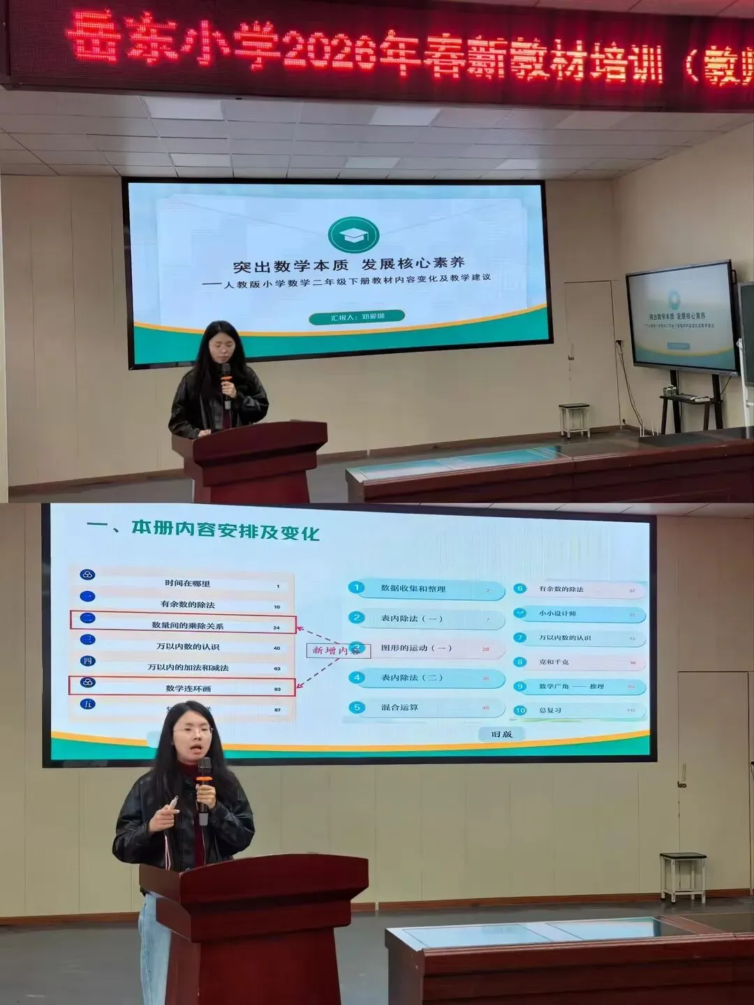 彭玉婷老师围绕《聚焦数学本质 发展核心素养—三年级下册数学教材总体变化及教学建议》,详解教材修订要点与教学实施策略;邓爱琳老师聚焦《突出数学本质 发展核心素养—二年级下册教材解读》,深挖数学学科本质,明晰低年级数学教学方向。