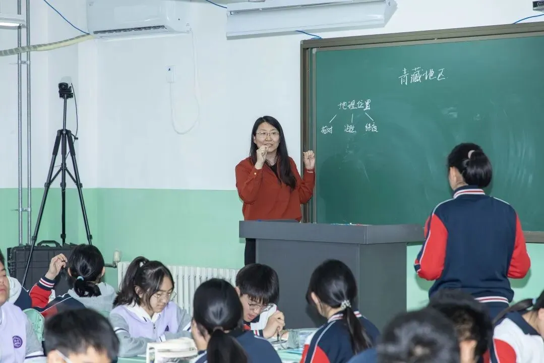 其次,南梨园中学的徐倩颖老师展示了《青藏地区》示范课。徐老师紧扣“地理位置—自然环境—农业特色—生态保护”的认识主线,借助地形剖面图、气候分布图等工具,引导学生在读图、析图、归纳中系统掌握区域特征。课堂注重方法渗透,学生在扎实的训练中习得了认识区域的一般思路与方法。