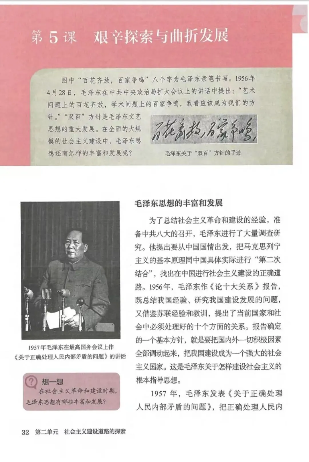新修订统编版初中历史教材八年级下册在第二单元《社会主义建设道路的探索》、第5课"艰辛探索与曲折发展"中的第一子目新增了关于毛泽东思想的丰富和发展的内容。教材的原文表述如下:"为了总结社会主义革命和建设的经验,准备中共八大的召开,毛泽东进行了大量调查研究。他提出要从中国国情出发,把马克思列宁主义的基本原理同中国具体实际进行第二次结合,找出在中国进行社会主义建设的正确道路。1956年,毛泽东作《论十大关系》报告,既总结我国经验、研究我国建设发展的问题,又借鉴苏联经验和教训,提出了当前国家和社会中必须处理好的十个方面的关系。报告确定的一个基本方针,就是要把国内外一切积极因素全部调动起来,把我国建设成为一个强大的社会主义国家。这是毛泽东关于怎样建设社会主义的根本指导思想。1957年,毛泽东发表《关于正确处理nn人民内部矛盾的问题》,把正确处理人民内部矛盾作为国家政治生活的主题,形成了一套系统的学说。这在马克思主义发展史上具有开创意义,至今仍发挥着积极的指导作用。"【教育部组织编写:《义务教育教科书 中国历史 八年级下册》;人民教育出版社,2025年,第32--33页】这是全书第一次出现关于“第二次结合”的表述。按照正常的逻辑推理,要进行第二次结合,那么必然存在第一次结合,以及第一次结合的成效和作用应该是极具启发性和划时代性的。那么究竟什么是第一次结合?其究竟又体现在教材的哪个位置和环节?以及具体的理论成果又究竟是怎样的?其实仔细联系八年级上册中国近代史的内容可知,马克思主义和中国具体国情的第一次结合主要体现在新民主主义革命阶段。如学者王树荫所说:“新民主主义革命时期的马克思主义中国化,以毛泽东同志为主要代表的 中国共产党人克服了把马克思主义教条化、把共产国际决议和苏联经验神圣化的错误倾向,找到了中国新民主主义革命的正确道路,实现了马克思主义中国化的第一次历史性飞跃,创立了毛泽东思想,新民主主义革命理论成为指导中国革命取得胜利的有力武器。”【王树荫:《深化对马克思主义基本原理同中国具体实际“第二次结合”的研究》,《高校马克思主义例论研究》,2025年第2期,第43页。】这即是马克思主义中国化的第一次成功实践,从党的发展历程来看,这样一种奇妙且富有创造性精神的转化,在一定意义上推动了党在自我发展和自我革命上的新生。从井冈山时期,到长征时期,再到抗日战争和人民解放战争时期,其实展现出了毛泽东思想的形成和逐渐成熟发展。不过为何新修订教材在八上之中没有这样的表述?而是在八下教材中明确定义了"第二次结合?"笔者认为,关于这一个问题,总的看来是马克思主义和中国具体国情的第一次结合,应该是在无形之中党自觉、自主地探索过程,它很难找到一个确切的时间点和年份去界定这种结合的瞬时发生,也势必会引发很多不同的学术意见和讨论。例如从1927年的八七汉口会议上,党内纠正了陈独秀的右倾机会主义错误,并且提出枪杆子里面出政权的口号,以武装斗争和土地革命为主要斗争方式,其实这已经算是党在发展过程中,将马克思主义和中国国情相结合的实例,因为这一时期党内已经意识到与国民党反动派一味妥协只会扼杀自我、扼杀革命的未来;而此后的井冈山农村革命根据地的开辟,则是进一步地将马克思主义与中国实际国情结合的典范,再到后面的遵义会议召开,意味着党事实上已经成为一个能够自主革命、独立判断的成熟的政党、一个能够正确引领革命发展前途和命运的政党了。所以从这个角度看来,第一次结合应当是一段紧密贴合的连续性、持续性的发展过程。而之所以八下教材会明确在教材表述中提及到第二次结合,综合联系当时的国内外形势,这样的表述是审时度势、实事求是的客观结果。时间进入到二十世纪五十年代中期,伴随着冷战的持续进行,国与国之间的关系也在发生潜在性的变化:“与此同时,国际共产主义运动也发生了一些重大事件。1956年2月苏联共产党举行第二次代表大会,尖锐地揭露了斯大林在领导苏联社会主义建设中的严重错误一级对他的个人崇拜所造成的严重后果。这在苏联国内和国际上都引起极大的震动。帝国主义趁机掀起世界性的反共反社会主义浪潮,在人民群众中造成不同程度的思想混乱,給国际共产主义运动带来巨大困难。中国共产党不赞成全盘否定斯大林领导时期苏联党和人民为社会主义而奋斗的历史,同时也认为,揭开斯大林的盖子,对于各国马克思主义政党,包括中国共产党,破除对斯大林和苏联经验的迷信,解放被教条主义绳索束缚的思想,努力寻求适合本国情况革命和建设道路,具有重要的意义。在国内外形势发生重大变化的情况下,刚刚进入社会主义的中国人民面临的最大课题,就是如何把握好这样的历史机遇,寻找一条适合自己国情的建设道路,尽快地把中国建设成为一个强大的社会主义国家。1956年初开始,中共中央和毛泽东等中央领导人提出了以苏联经验为鉴戒,总结中国前几年建设的经验,走适合中国情况的建设社会主义道路的问题,并初步进行了探索。”【庞松主编:《简明中华人民共和国史》;广东教育出版社,2001年,第162--163页】这在某种意义上启发我们,第二次结合的实际含义是,在新的时代背景下,以毛